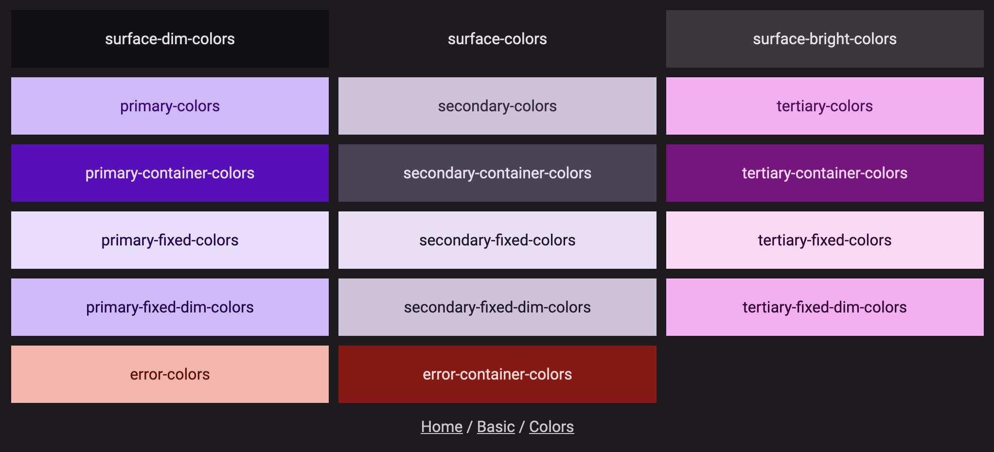 mat.get-theme-color($theme, $color-role)As you can see, you obviously need the $theme object in order to use this function. Color role is a little more nuanced. There isn't really a good way to understand what roles should actually be used in what situations, or even what they will look like. Here is the example given at this exact moment.